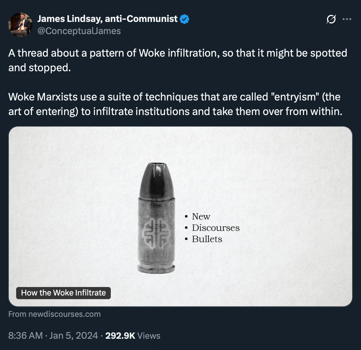 American author and public speaker, James Lindsay vividly illustrates this power maneuver, otherwise known as an “entryism” tactic, by DEI proponents in a riveting Twitter/𝕏 thread. (I highly recommend pausing to read the thread in its entirety to fully grasp the severity of this unassuming tactic. Once you see it, you can’t unsee it; it’s pervasive.)
